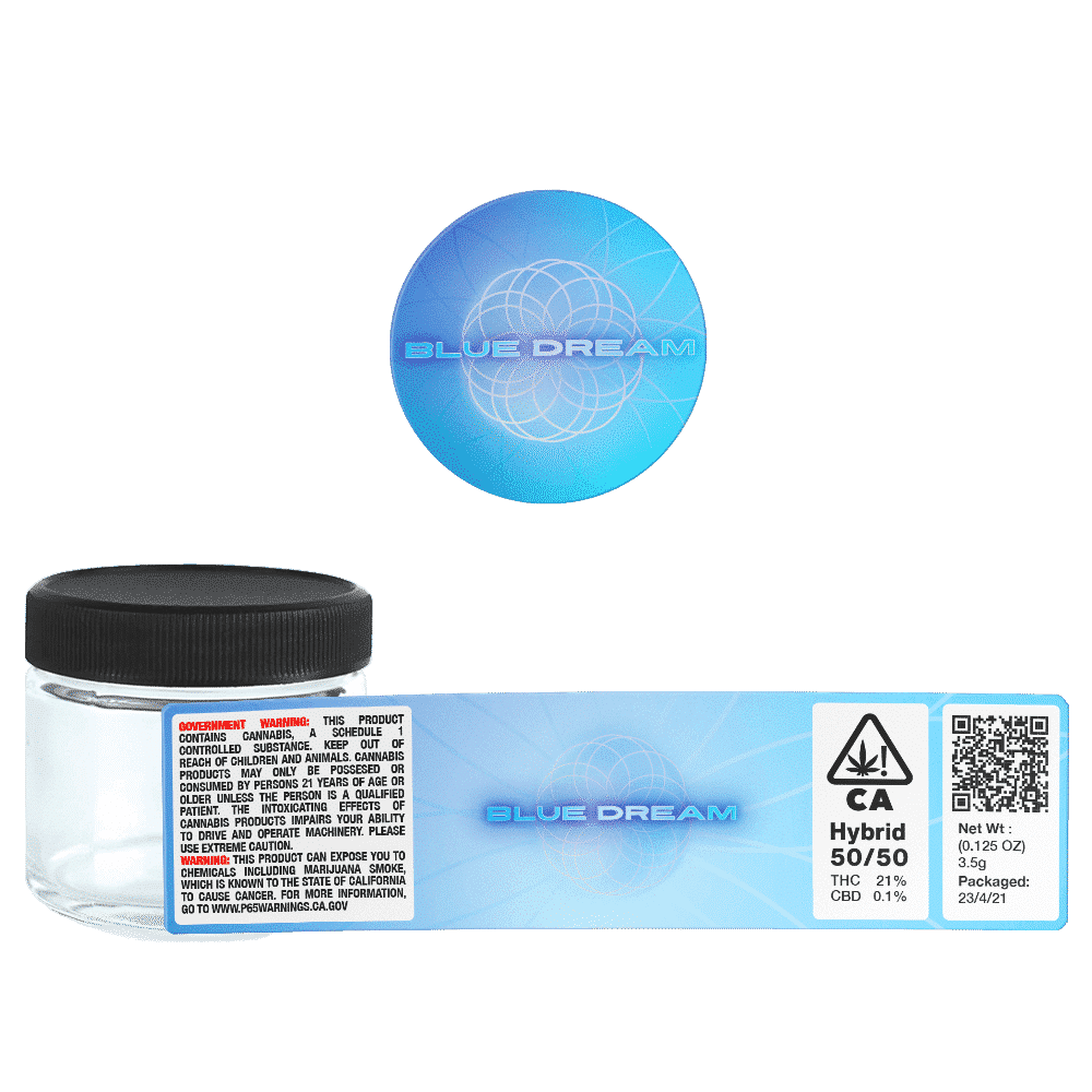 Unlabelled 3.5g Blue Dream Glass Jars  – This option ships Blue Dream labels and 60ml Cali Jars separately. This option is more cost effective however you’ll have to apply the labels yourself.