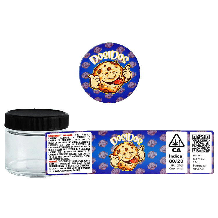 Unlabelled 3.5g Dosidos Glass Jars  – This option ships Dosidos labels and 60ml Cali Jars separately. This option is more cost effective however you’ll have to apply the labels yourself.