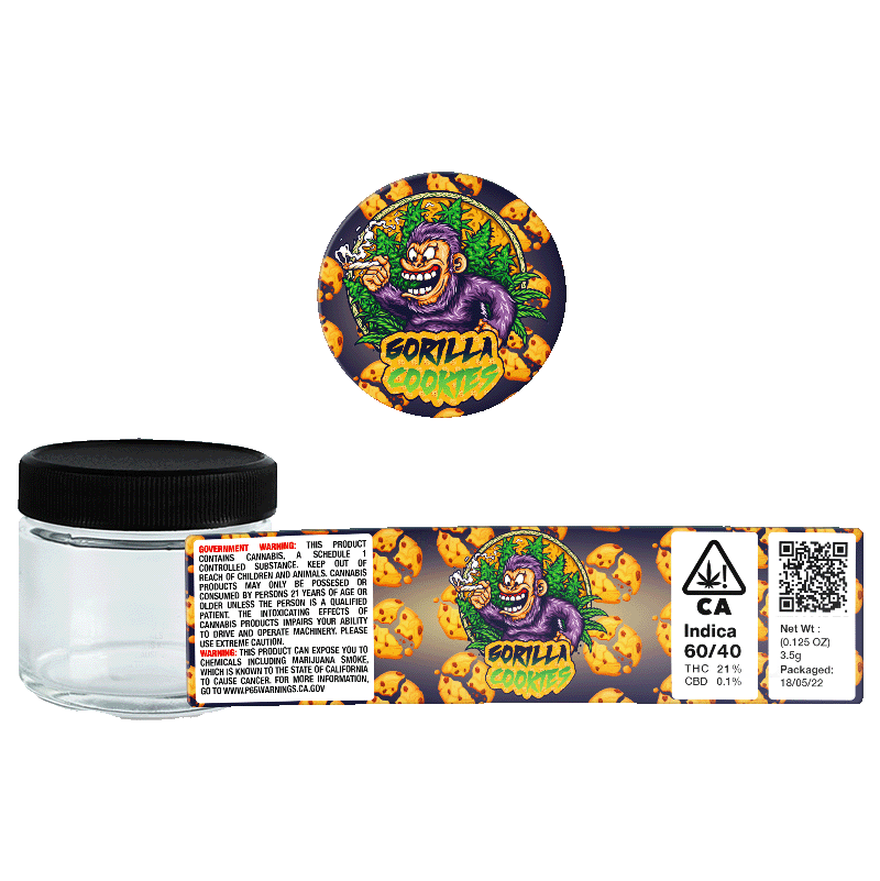 Unlabelled 3.5g Gorilla Cookies Glass Jars  – This option ships Gorilla Cookies labels and 60ml Cali Jars separately. This option is more cost effective however you’ll have to apply the labels yourself.