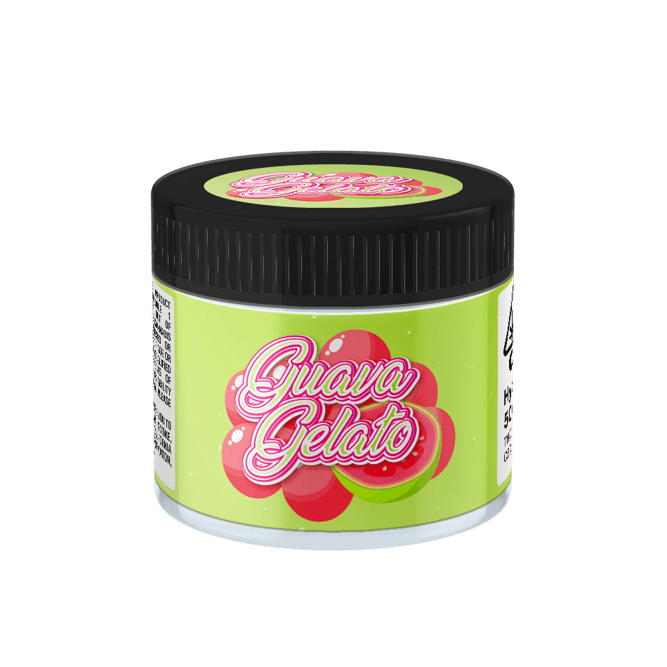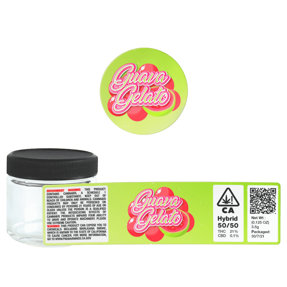 Unlabelled 3.5g Guava Gelato Glass Jars  – This option ships Guava Gelato labels and 60ml Cali Jars separately. This option is more cost effective however you’ll have to apply the labels yourself.