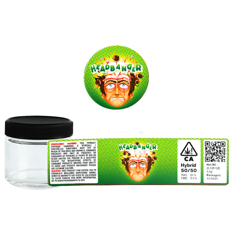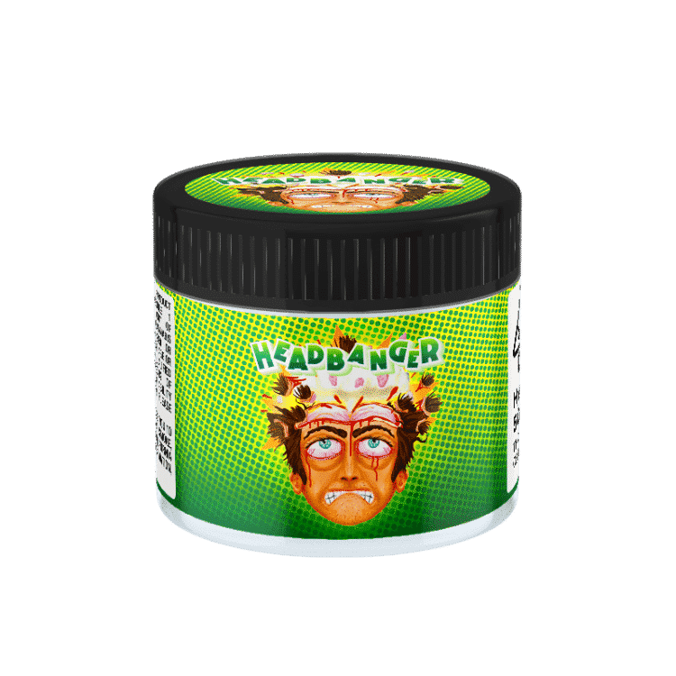 Labelled 3.5g Headbanger Glass Jars – This option ships Ready Made Headbanger 60ml labelled Cali Jars – ready to use upon arrival.