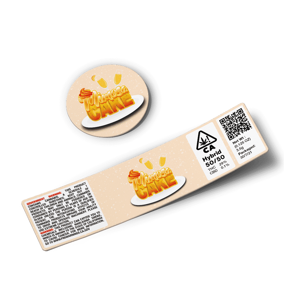 Whether it’s Mimosa Cake 60ml/3.5g Glass Jar Labels, or any other strain of Glass Jar Stickers – be sure to work with professionals to give your brand that extra edge.