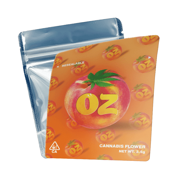 Labelled Peach Oz Mylar Bags – This option ships Ready Made Peach Oz Strain labelled Cali Packs – ready to use upon arrival.