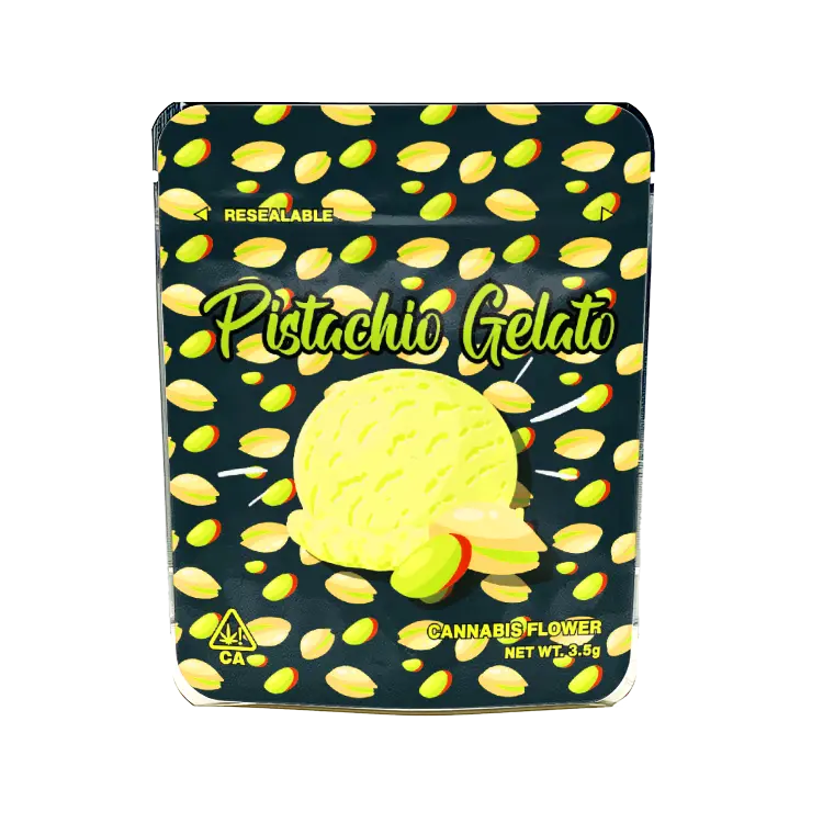 Ready Made Smell Proof Pistachio Gelato Strain Mylar Bags/Mylar Pouches/Cali Packs Labelled or Unlabelled.
