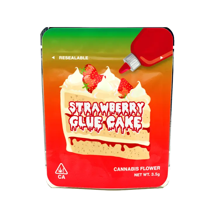 LabelledStrawberry Glue Cake Mylar Bags – This option ships Ready Made Strawberry Glue Cake train labelled Cali Packs – ready to use upon arrival.