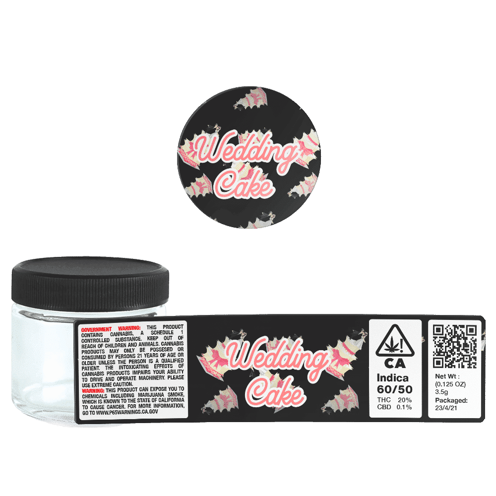 Unlabelled 3.5g Wedding Cake Glass Jars  – This option ships Wedding Cake labels and 60ml Cali Jars separately. This option is more cost effective however you’ll have to apply the labels yourself.