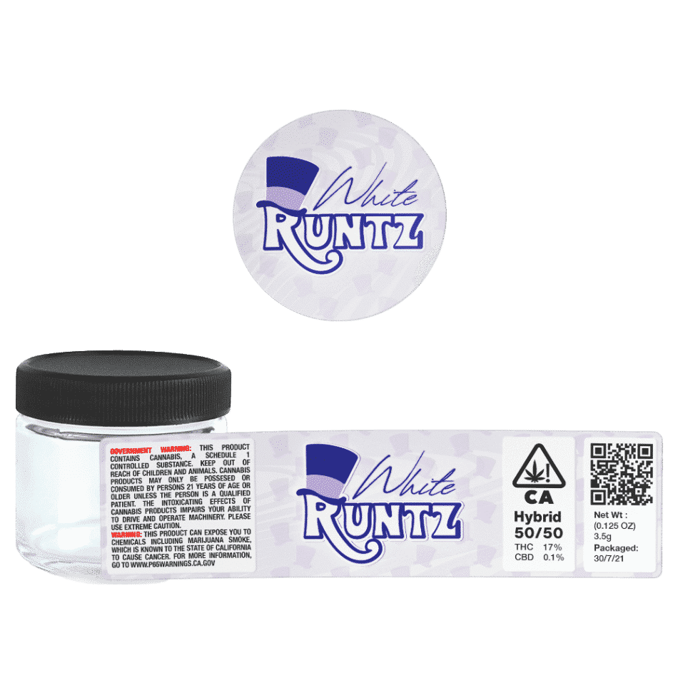Unlabelled 3.5g White Runtz Glass Jars  – This option ships White Runtz labels and 60ml Cali Jars separately. This option is more cost effective however you’ll have to apply the labels yourself.